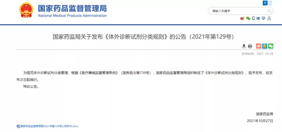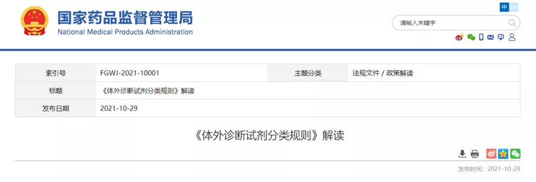 第八條 體外診斷試劑分類目錄由國家藥品監(jiān)督管理局制定并發(fā)布。國家藥品監(jiān)督管理局根據(jù)體外診斷試劑生產(chǎn)、經(jīng)營、使用情況,及時對體外診斷試劑的風險變化進行分析、評價,對體外診斷試劑分類目錄進行調(diào)整。