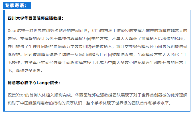 2022年5月20日,四川大學(xué)華西醫(yī)院郭應(yīng)強(qiáng)教授團(tuán)隊成功應(yīng)用南京圣德醫(yī)療科技有限公司研制的帶結(jié)構(gòu)貼合錨定及全新釋放方式的自膨式TAVR產(chǎn)品Xcor,為一位外科高危高齡重度主動脈瓣狹窄合并中度關(guān)閉不全患者實(shí)施了經(jīng)導(dǎo)管主動脈瓣膜置換手術(shù)。該例手術(shù)也標(biāo)志著,由四川大學(xué)華西醫(yī)院郭應(yīng)強(qiáng)教授牽頭的全國多中心研究正式起航。