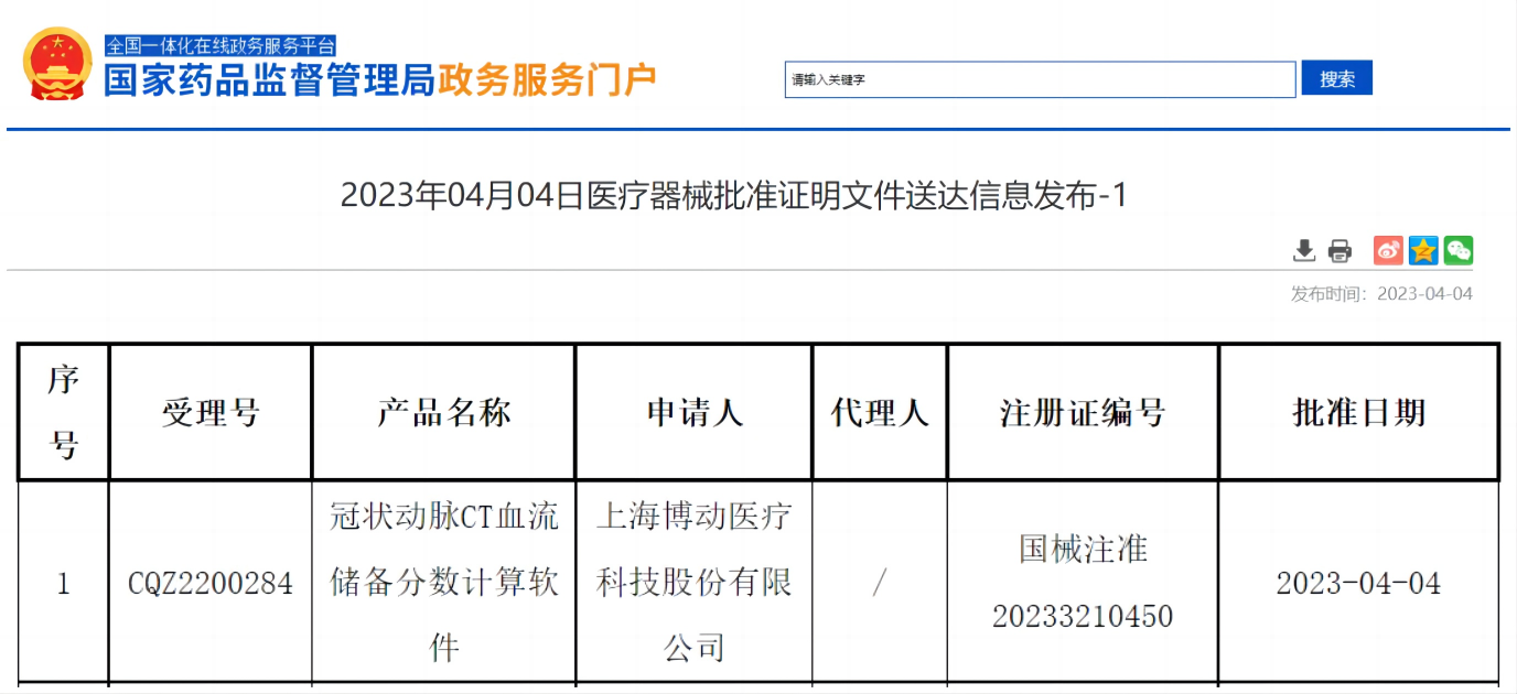 2023年4月4日,經(jīng)國(guó)家藥監(jiān)局NMPA公示,上海博動(dòng)醫(yī)療科技股份有限公司的創(chuàng)新醫(yī)療器械“冠狀動(dòng)脈CT血流儲(chǔ)備分?jǐn)?shù)計(jì)算軟件”(國(guó)械注準(zhǔn)20233210450)獲得國(guó)家藥品監(jiān)督管理局批準(zhǔn)上市,奧泰康承擔(dān)本項(xiàng)目臨床試驗(yàn)服務(wù),系2023年奧泰康助力獲得的第六張三類(lèi)醫(yī)療器械注冊(cè)證。