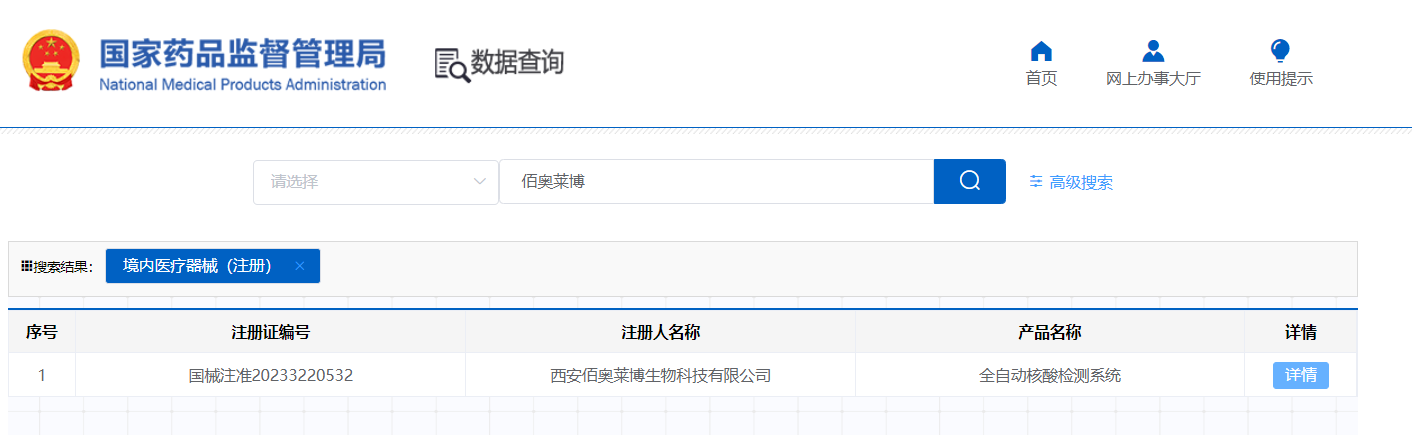 2023年4月24日,經國家藥品監(jiān)督管理局公示,西安佰奧萊博生物科技有限公司的“全自動核酸檢測系統”(國械注準20233220532)獲得NMPA批準上市,系2023年奧泰康助力獲得的第10張三類醫(yī)療器械注冊證。