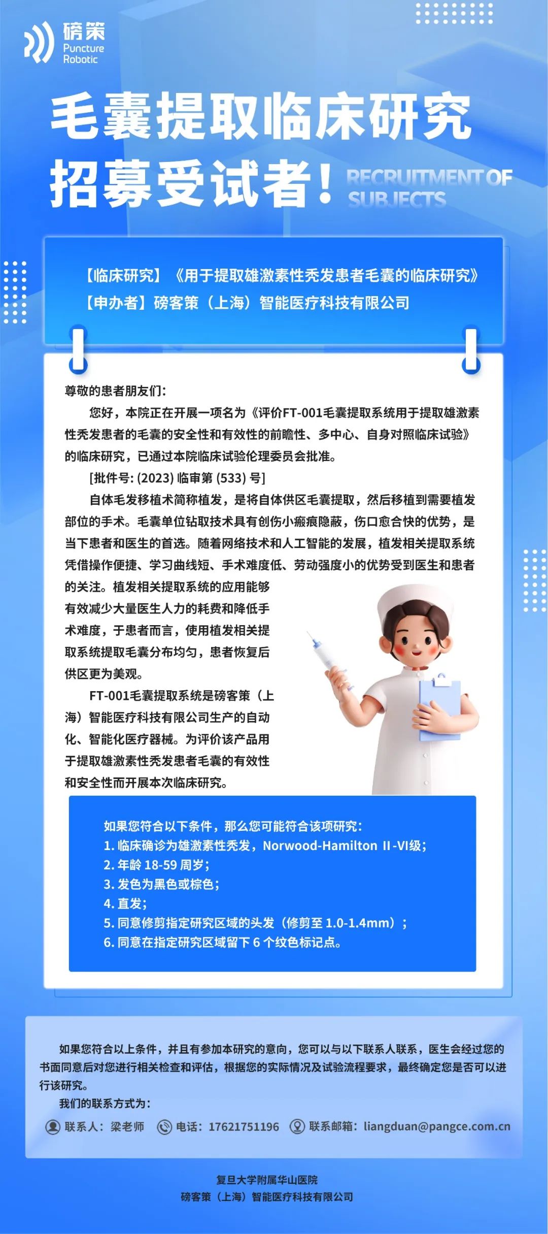 近期,由磅客策 (上海)智能醫(yī)療科技有限公司研發(fā)的磅策植發(fā)機器人在上海成功召開臨床試驗啟動會暨人工智能毛發(fā)創(chuàng)新中心落成典禮,奧泰康負責臨床試驗服務。
