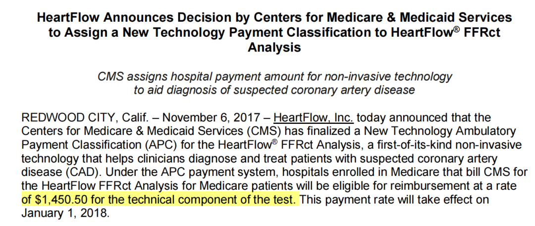 美國(guó)HeartFlow公司的FFRCT從2014年開始在歐美日韓等發(fā)達(dá)國(guó)家進(jìn)行了廣泛應(yīng)用,被寫入多個(gè)臨床指南,且多個(gè)保險(xiǎn)產(chǎn)品都可報(bào)銷相關(guān)的檢查費(fèi)用,從2018年1月1日起,美國(guó)醫(yī)保報(bào)銷金額為1450.5美元/例(圖3)。