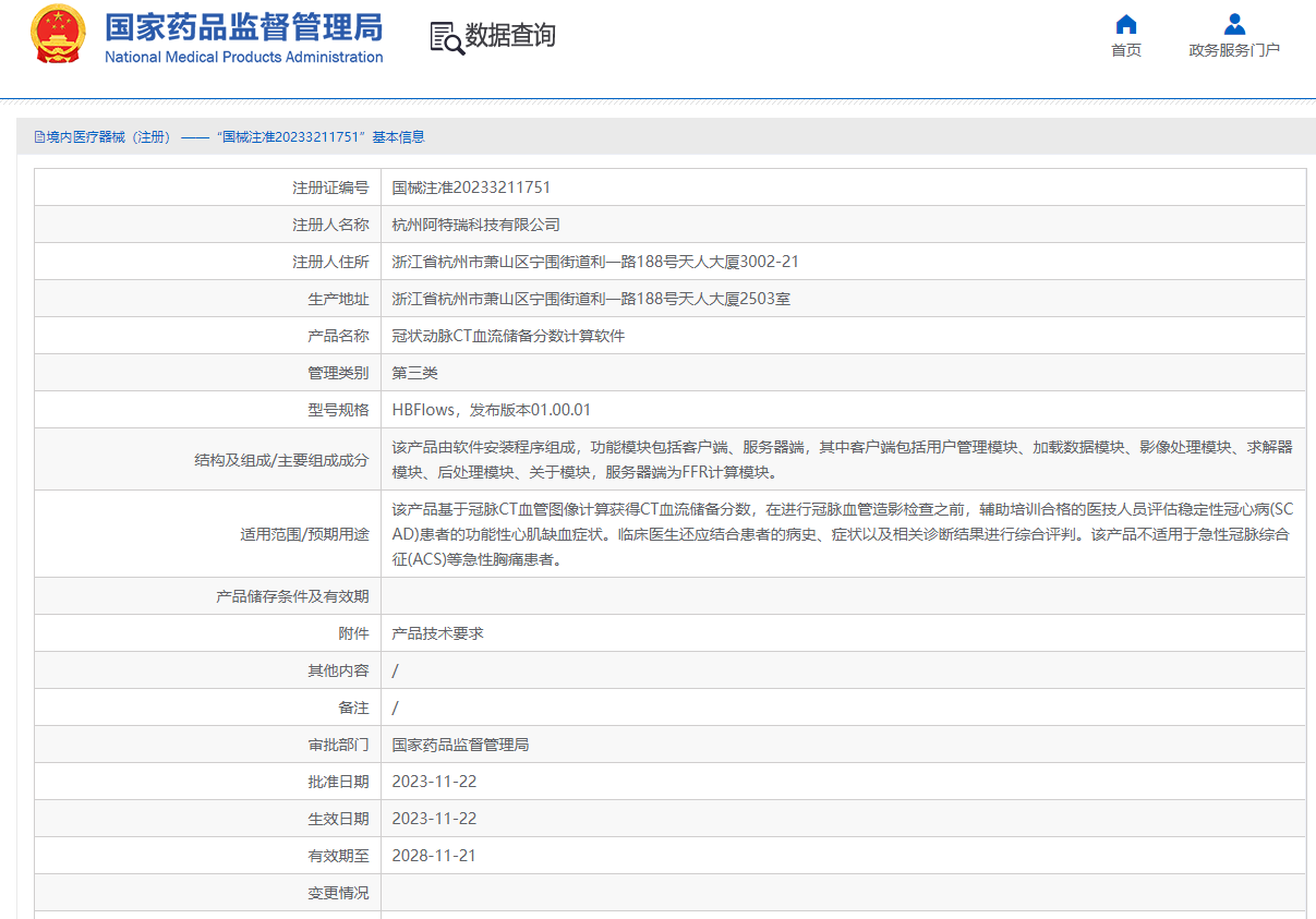 近日,國(guó)家藥監(jiān)局網(wǎng)站公開發(fā)布了最新一批三類醫(yī)療器械批準(zhǔn)清單,杭州阿特瑞科技有限公司研發(fā)的《冠狀動(dòng)脈CT血流儲(chǔ)備分?jǐn)?shù)計(jì)算軟件》(簡(jiǎn)稱FFRCT)已經(jīng)獲批上市(圖1),該軟件核心算法完全自主研發(fā),不受制于人。該產(chǎn)品由中美團(tuán)隊(duì)聯(lián)合研發(fā),雙院士團(tuán)隊(duì)臨床驗(yàn)證,是目前國(guó)內(nèi)唯一采用全三維流體力學(xué)方程+超級(jí)計(jì)算機(jī)計(jì)算且被商業(yè)保險(xiǎn)公司認(rèn)可的產(chǎn)品,也是目前被國(guó)家藥監(jiān)局認(rèn)可不需要在“灰區(qū)”(介于0.75至0.85)和冠脈彌漫性病變進(jìn)一步研究的無創(chuàng)醫(yī)療產(chǎn)品。