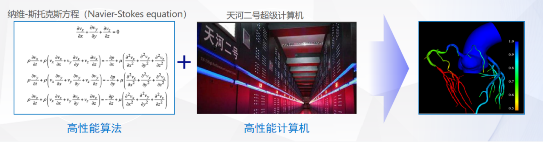 眾所周知, FFR是心肌缺血評(píng)價(jià)的“金標(biāo)準(zhǔn)”,是臨床判斷是否對(duì)冠心病患者施血管內(nèi)干預(yù)治療的主要依據(jù)。傳統(tǒng)方法是通過有創(chuàng)方法獲得,近年來隨著計(jì)算機(jī)技術(shù)的迅速發(fā)展,基于CT的無創(chuàng)FFR測(cè)量技術(shù)(即FFRCT)得到了快速發(fā)展。該技術(shù)起源于美國(guó)HeartFlow公司,其基本原理是基于常規(guī)CCTA所獲得的冠狀動(dòng)脈三維圖像,采用流體力學(xué)方程(納維斯托克斯方程)在高性能計(jì)算機(jī)(超級(jí)計(jì)算機(jī))上進(jìn)行流體力學(xué)仿真計(jì)算,獲得冠狀動(dòng)脈內(nèi)血流動(dòng)力學(xué)參數(shù),例如血壓、血流速度、血流量等,進(jìn)而得到血流儲(chǔ)備分?jǐn)?shù)(FFR)(圖2)。