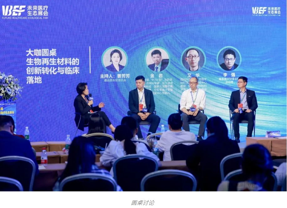 隨后,科技部“973計劃”與重點項目首席科學家、長江學者特聘教授、國家杰出青年基金獲得者、空軍軍醫(yī)大學組織工程研發(fā)中心創(chuàng)始人金巖教授;四川大學國家生物醫(yī)學材料工程技術研究中心教授、國際生物材料科學與工程聯合會Fellow艾華教授;奧泰康SFM事業(yè)部總經理李強先生以及道遠資本投資總監(jiān)姜芳芳共同圍繞《生物再生材料的創(chuàng)新轉化與臨床落地》這一主題進行了分享與探討。