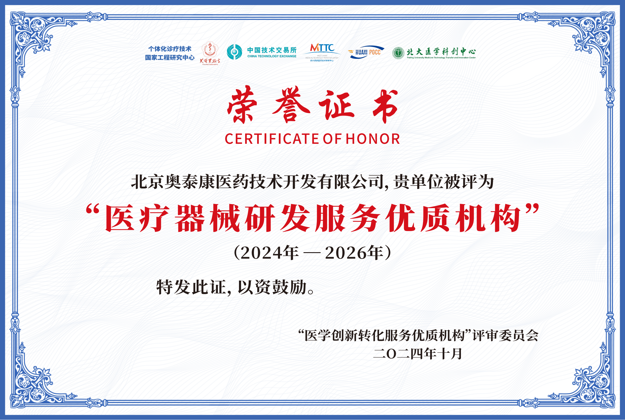 2024年10月14日,由中南大學(xué)、個(gè)體化診療技術(shù)國(guó)家工程研究中心、芙蓉實(shí)驗(yàn)室等單位聯(lián)合主辦的個(gè)體化醫(yī)學(xué)研討會(huì)暨第四屆衛(wèi)生健康創(chuàng)新與轉(zhuǎn)化管理論壇于海南落幕,會(huì)議聚集來(lái)自全國(guó)各地的專家學(xué)者、相關(guān)政府部門、醫(yī)療衛(wèi)生健康領(lǐng)域高校、科研院所、醫(yī)院、醫(yī)療健康大數(shù)據(jù)相關(guān)產(chǎn)業(yè)代表400余人參會(huì)。奧泰康應(yīng)邀參加大會(huì),并獲評(píng)2024年度“醫(yī)療器械研發(fā)服務(wù)優(yōu)質(zhì)機(jī)構(gòu)”。