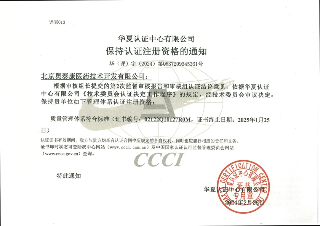 2024年3月,北京奧泰康醫(yī)藥技術(shù)開發(fā)有限公司經(jīng)華夏認(rèn)證中心有限公司(CCCI)認(rèn)證,順利通過ISO9001:2015 標(biāo)準(zhǔn)質(zhì)量管理體系認(rèn)證年度審核,認(rèn)證范圍為醫(yī)療器械臨床試驗及產(chǎn)品注冊服務(wù)。嚴(yán)格的質(zhì)量管理體系是企業(yè)持續(xù)、穩(wěn)定、健康發(fā)展的根本保證,通過ISO9001認(rèn)證標(biāo)志著我司的醫(yī)療器械臨床試驗及產(chǎn)品注冊服務(wù)與管理體系已達(dá)到了國際標(biāo)準(zhǔn)、行業(yè)標(biāo)準(zhǔn),在制度化、體系化和標(biāo)準(zhǔn)化方面取得了里程碑式的進(jìn)展。