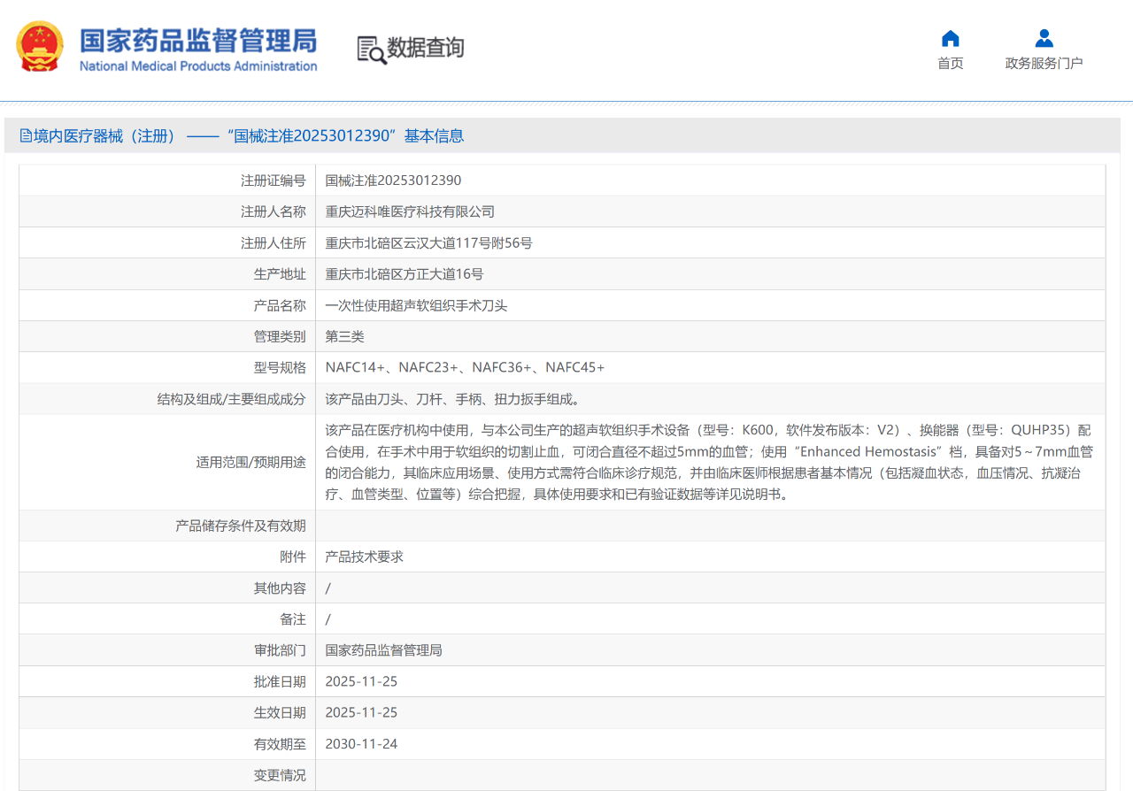 MA成果[慶祝]奧泰康助力邁科唯「一次性使用超聲軟組織手術刀頭」獲批上市[煙花]系本年度助力獲得的第14張三類注冊證??2025年11月,經國家藥品監(jiān)督管理局公示,重慶邁科唯醫(yī)療科技有限公司研發(fā)的一次性使用超聲軟組織手術刀頭(國械注準20253012390)獲得NMPA批準上市,奧泰康提供市場準入MA解決方案。