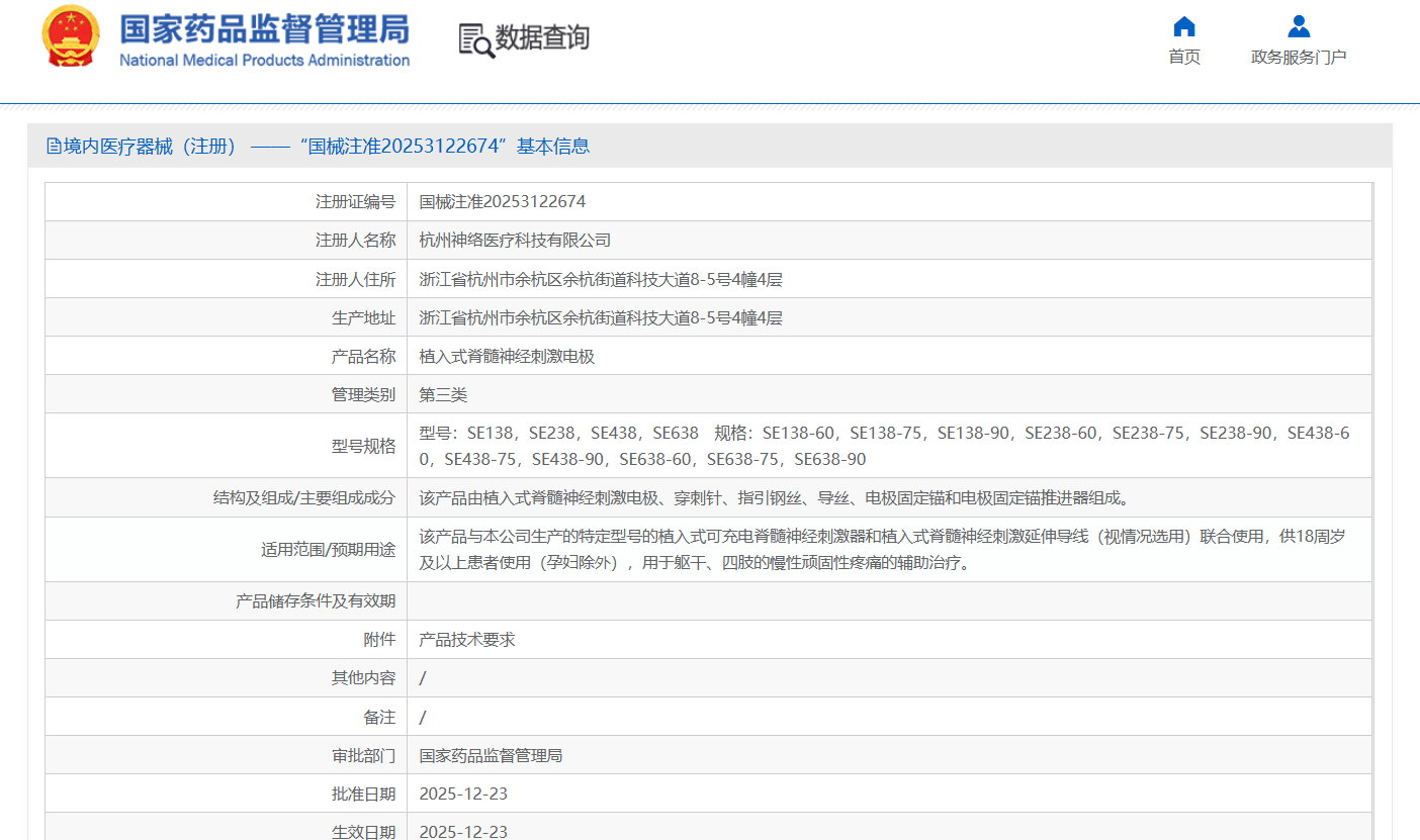 MA成果[慶祝] 奧泰康助力神絡(luò)醫(yī)療「植入式脊髓神經(jīng)刺激電極」獲批上市[煙花] ——系本年度助力獲得的第20張三類(lèi)注冊(cè)證??近期,經(jīng)國(guó)家藥品監(jiān)督管理局公示,杭州神絡(luò)醫(yī)療科技有限公司自主研發(fā)的產(chǎn)品植入式脊髓神經(jīng)刺激電極(國(guó)械注準(zhǔn)20253122674)獲得NMPA批準(zhǔn)上市,奧泰康提供MA解決方案。