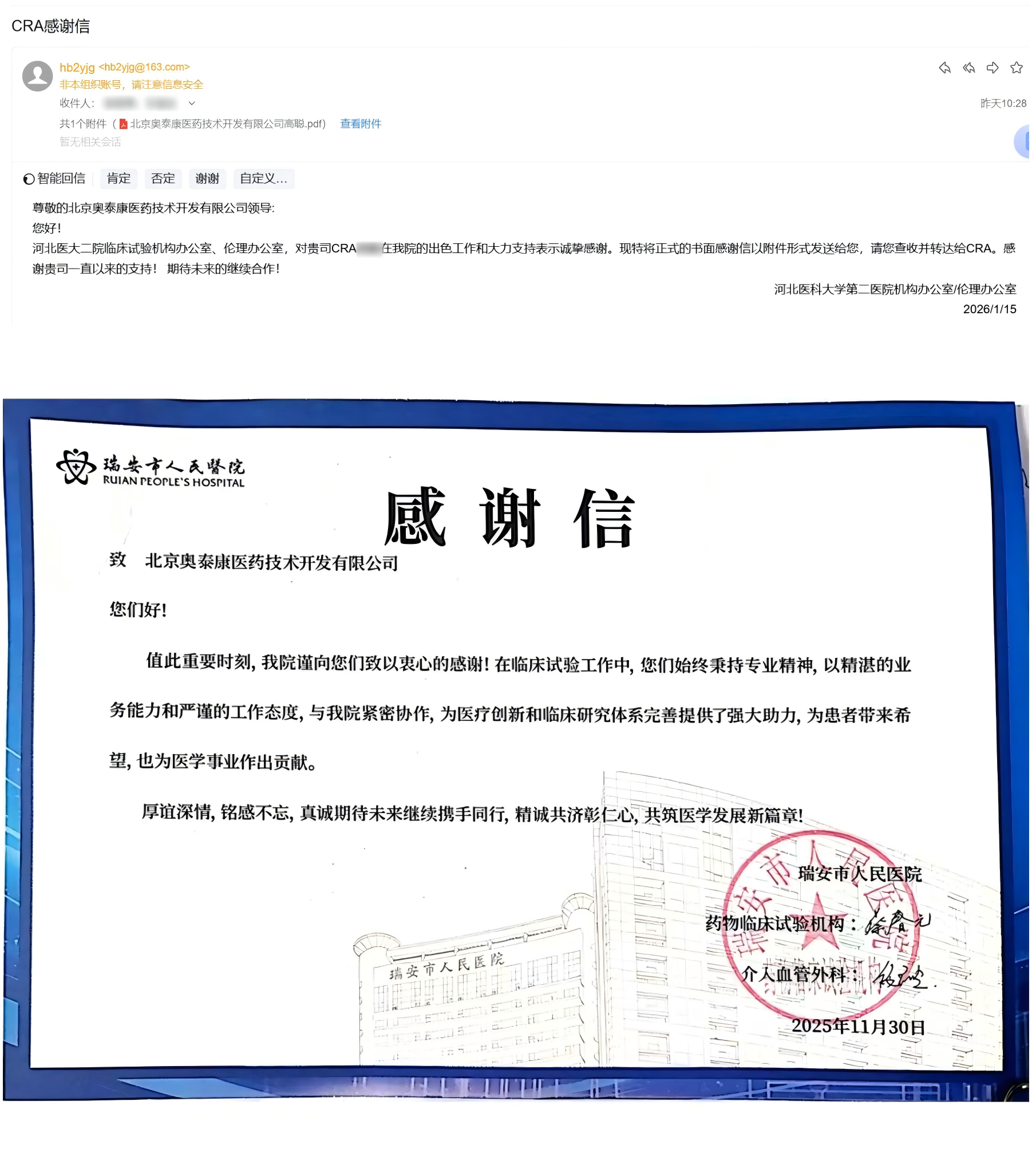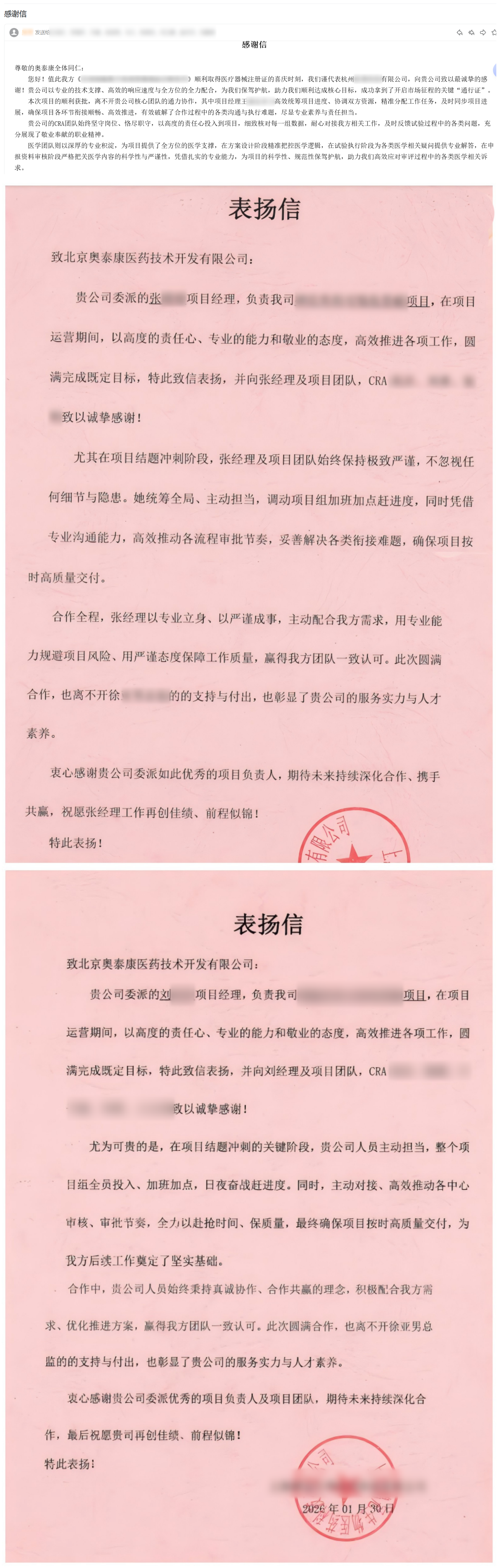 同時(shí)在賦能客戶、深耕臨床的道路上,我們始終以臨床需求為核心,把細(xì)節(jié)刻進(jìn)服務(wù)的每一個(gè)環(huán)節(jié),把責(zé)任融入工作的每一寸肌理;在臨床試驗(yàn)項(xiàng)目中,以卓越的統(tǒng)籌能力把控全局,以嚴(yán)謹(jǐn)?shù)膶I(yè)態(tài)度精益求精,以高效的執(zhí)行力度搶時(shí)間、保質(zhì)量、守承諾,全力以赴推動(dòng)每一個(gè)項(xiàng)目高效落地、高質(zhì)量交付,收到了客戶的高度稱贊與認(rèn)可。每一份致謝,都彰顯著奧泰康的專業(yè)實(shí)力與服務(wù)溫度,都是對(duì)我們服務(wù)能力的最佳佐證,更是我們前行的底氣。